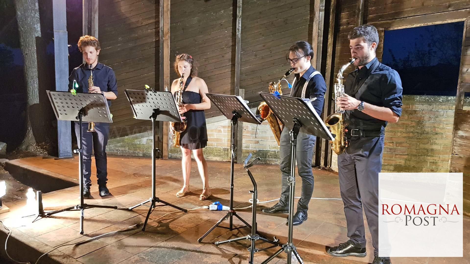 L’evento si è concluso con il concerto del Forlì Saxophone Quartet, composto dai giovani musicisti Lorenzo Briganti (sax soprano e contralto), Lorenzo Manzato (sax contralto), Sara Mancini (sax tenore) e Alessandro Vio (sax baritono), che hanno interpretato brani di Bizet, Verdi, Rossini, Puccini, Iturralde, Joplin, Gershwin, Bernstein, McMillan e Nagle. L’anfiteatro all’aperto, adiacente alla chiesa di Sadurano, dove si è svolta l’esibizione del quartetto di sax, inutilizzato da tempo, si è dimostrato una location ideale per iniziative e spettacoli del genere: l’auspicio è che, in un prossimo futuro, possa essere valorizzato con altri eventi, vista la funzionalità degli spazi e il clima sempre favorevole, anche quando in città le temperature sono elevatissime.