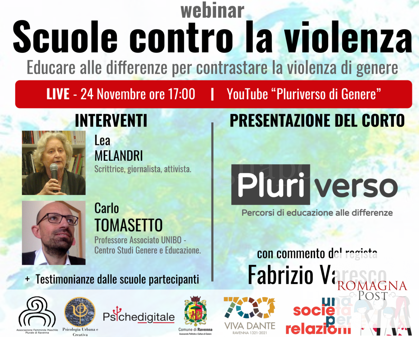 Durante l’evento verrà presentato il cortometraggio “Pluriverso”, realizzato nel 2020 da Fabrizio Varesco per conto di APS Femminile Maschile Plurale assieme ai protagonisti della quinta edizione del progetto omonimo, che ha visto la partecipazione delle realtà scolastiche del ravennate per la realizzazione di una serie di percorsi con le classi ed eventi formativi destinati ai docenti.