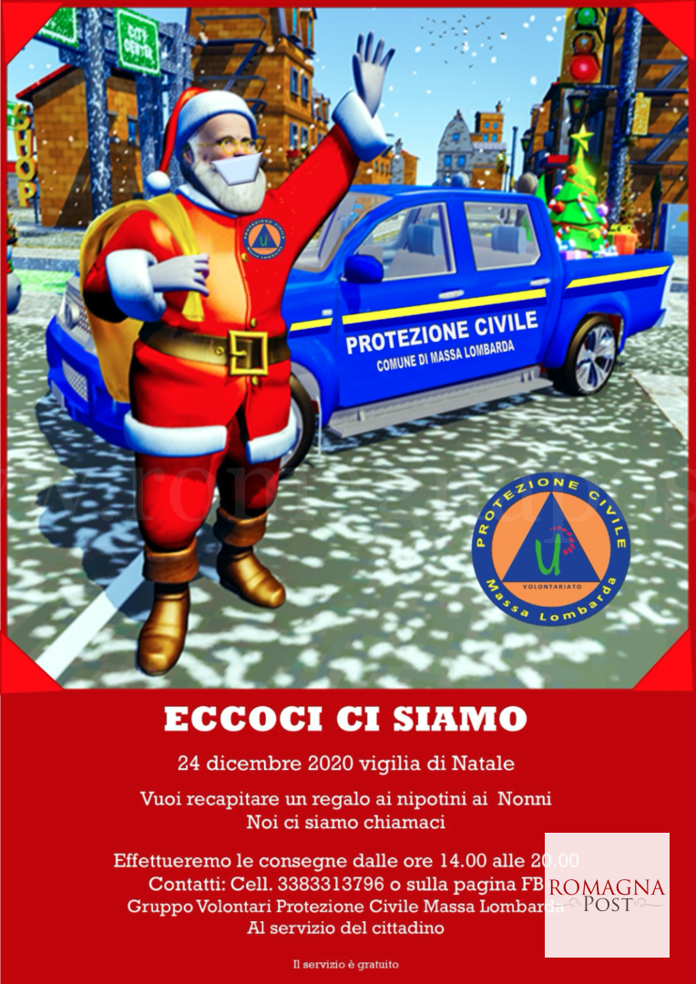 È possibile richiedere questo servizio dal 5 al 20 dicembre, chiamando il numero 338 3313796 o attraverso la pagina Facebook Gruppo Volontari Protezione Civile. La consegna sarà effettuata solo all’interno del comune di Massa Lombarda e avverrà il 24 dicembre dalle 14 alle 20. Il servizio è gratuito.