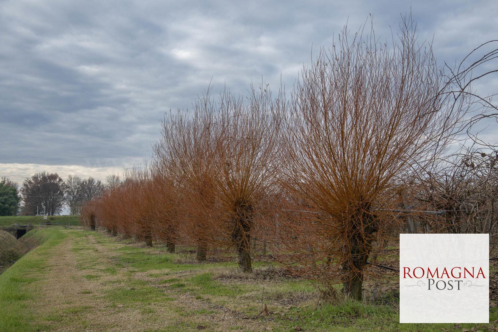 Ma ritorniamo alla via Bovelacci, perché quando ormai la si è percorsa tutta, ci si imbatte in uno straordinario filare di salici da vimini formato da 10 piante (vedi foto Giulio Sagradini), in adiacenza ad un frutteto di kiwi. Personalmente sul territorio comunale di Forlì non ho visto altre piante di vimini così, sia per il numero, sia per l’altezza e le dimensioni dei fusti, sia anche per la cura con cui vengono tenute. Sono dei veri e propri alberi che producono tantissimi rami flessibili che storicamente sono da sempre elementi preziosissimi per la conduzione delle attività agricole.