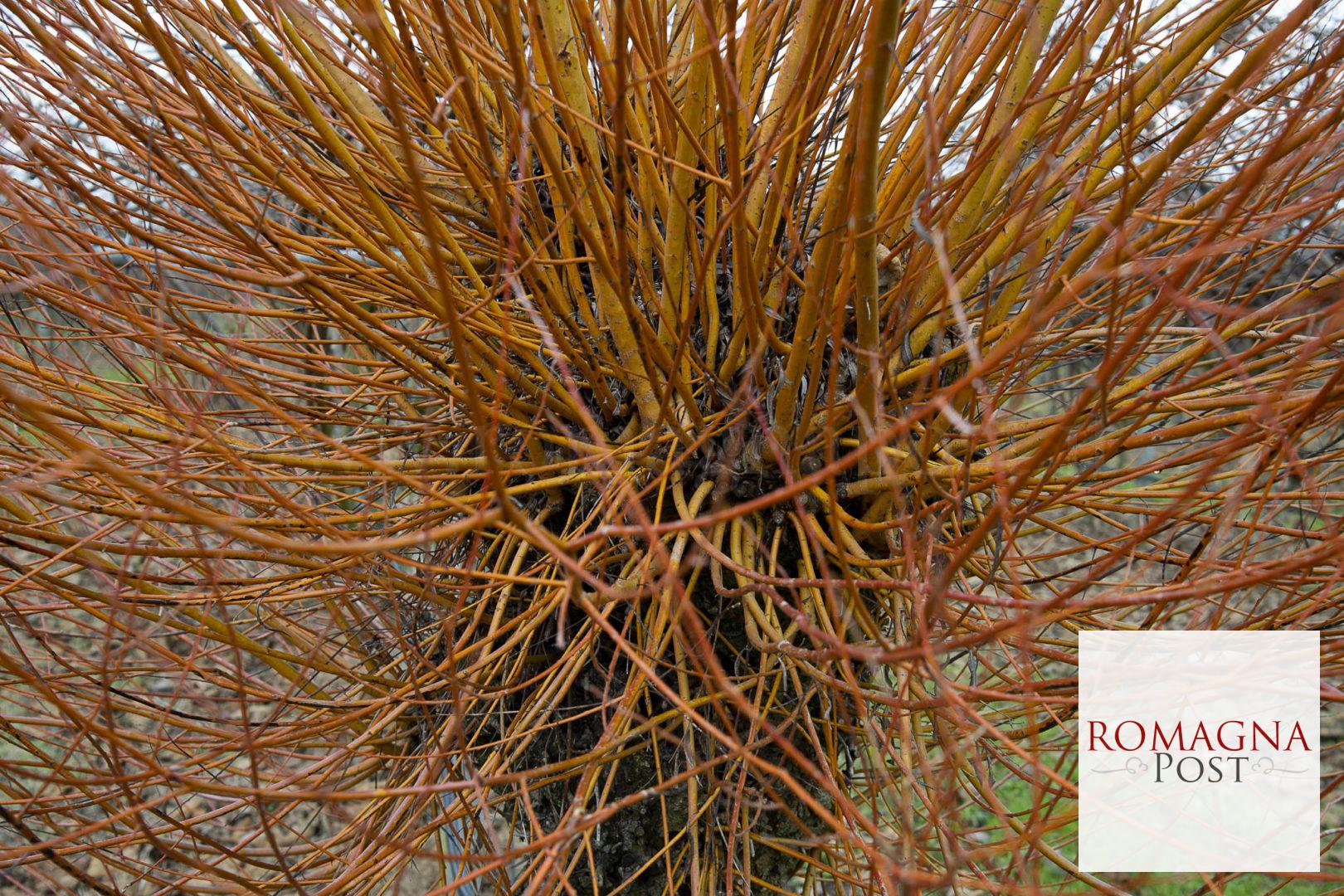 Ho un ricordo molto nitido di quando, nel mese di febbraio, giungeva il momento della potatura dei filari di viti delle vigne e dei singoli filari che dividevano i vari appezzamenti di terreno del podere che la mia famiglia coltivava a mezzadria, in via Viola del Monte a Santa Croce di Bertinoro. Anche per questa attività, nei giorni precedenti l’avvio, c’era, da parte degli uomini di casa, un lavoro di preparazione per non lasciare niente al caso. Questo permetteva che, una volta avviata, la potatura potesse procedere spedita e senza intoppi in modo da poter impiegare il minor tempo possibile, nonostante durasse diversi giorni. Si affilavano le cesoie con la mola (“rude al muiĕt da pudé” da non confondere con le forbici – “al giûr o toujours” – usate in sartoria che, seppure simili, hanno le lame più lunghe e l’impugnatura più corta). Già da qualche tempo erano pronti i rametti di vimini di salici per fissare i tralci ai fili, così come le viti, se necessario, venivano fissate ai pali o agli alberi, spesso ciliegi o altre piante da frutto, che si trovavano a distanza regolare all’interno del filare; operazioni che venivano eseguite da mani ruvide che lavoravano veloci, con maestria e speditezza, fissando tutto abilmente. Oggi per lo più si usano fascette o legacci di plastica, ma un tempo ovviamente non era così. Tutti i legacci (e molto altro ancora) erano ottenuti da un albero straordinario, il salice da vimini (Salix viminalis), chiamato localmente “vênc”. Quest’albero ha avuto un’enorme importanza nell’economia contadina.