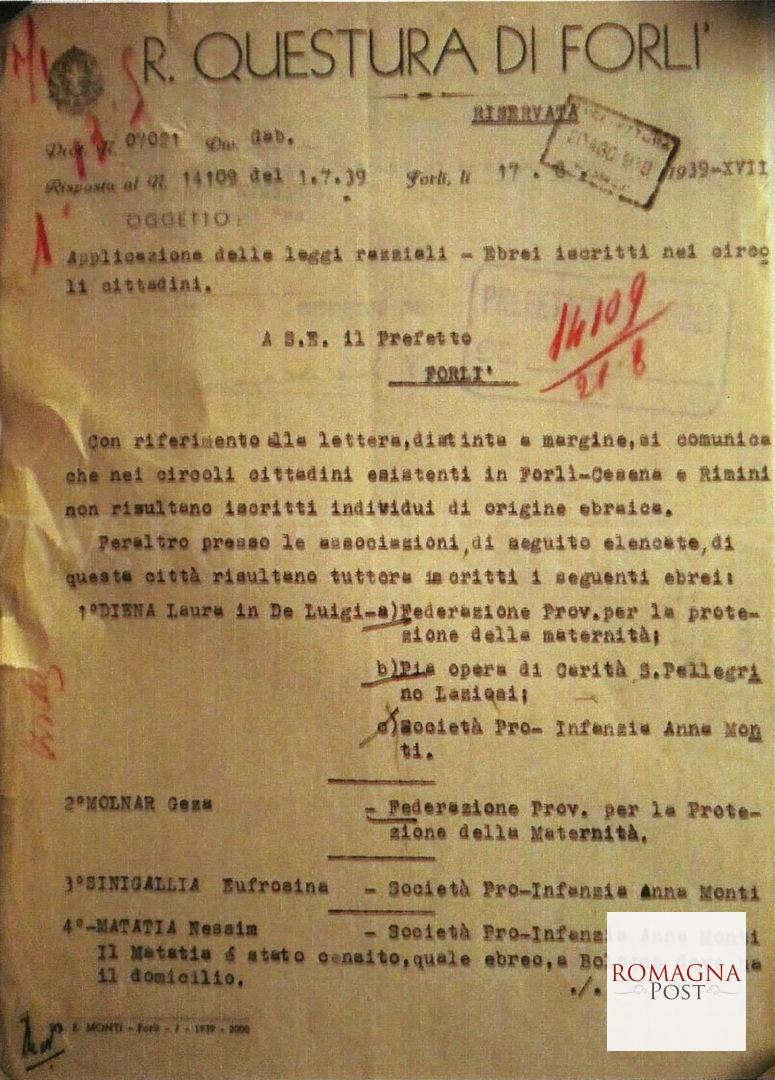 Va allora ricordata la famiglia di Nissim Matatia, che era molto ben integrata in città ed in contatto con importanti esponenti del regime fascista perché era titolare di un avviato negozio di pellicceria sito sotto il loggiato del palazzo Comunale. L’attività commerciale di Nissim e Leone Matatia, originari di Corfù e giunti in Italia nel 1920, veniva esercitata al numero 3 di piazza Saffi. Con il ricavato del lavoro Nissim Matatia acquistò una villetta a Riccione dove poter trascorrere le vacanze estive. Ad un certo momento si ritrovò come vicino di casa Benito Mussolini che con la propria famiglia, nel 1930, acquisì la villa adiacente, tanto che i componenti dei due nuclei familiari ebbero la possibilità di frequentarsi, in particolare i bambini. Dopo la promulgazione delle leggi razziali del 1938 i Matatia divennero automaticamente i “vicini scomodi”, come dal titolo del libro di Roberto Matatia, edito da Giuntina, dove si racconta la “storia di un ebreo di provincia, di sua moglie e dei suoi tre figli negli anni del fascismo”. Da quel momento la vita dei Matatia cambiò radicalmente, fino al un tragico epilogo: ci furono forti pressioni per la vendita della villa, i ragazzi espulsi dalle scuole, Leone Matatia fuggì in Svizzera, poi furono arrestati prima di Nissim e il figlio Roberto a Bologna (novembre ‘43), e poi la moglie Matilde Hakim e gli altri figli Beniamino e Camelia a Savignano sul Panaro, loro ultimo rifugio. Nissim e Roberto, furono trasferiti a Verona, poi a Milano, successivamente vennero portati ad Auschwitz con il convoglio del 6 dicembre 1943. Matilde, Camelia e Beniamino, detenuti prima a Forlì (ex Albergo Commercio), e poi a Milano, con il convoglio del 30 gennaio 1944. L’unico superstite fu Beniamino, il quale, tuttavia, morì poco dopo la liberazione del campo di Auschwitz per gli stenti patiti durante la prigionia.