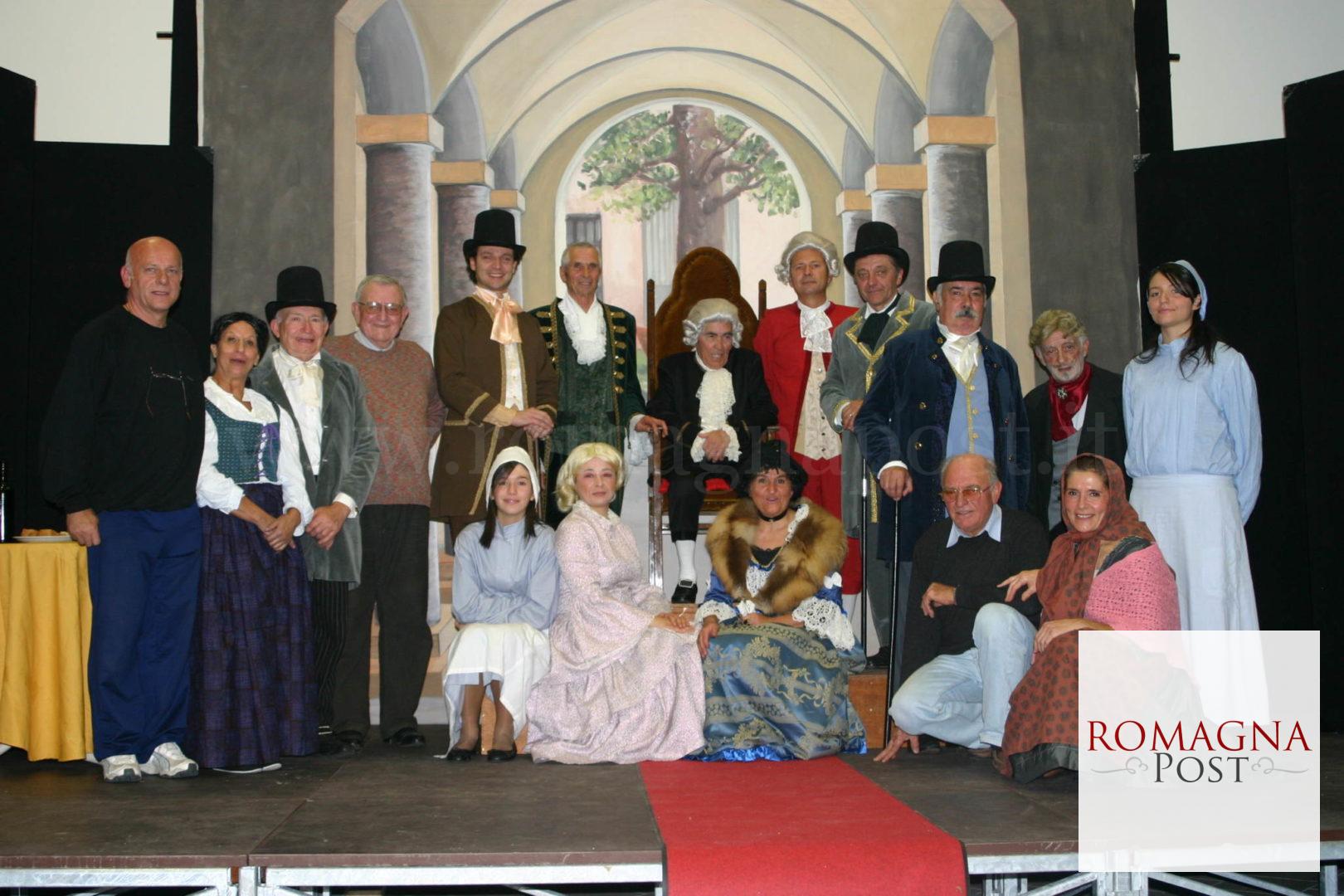 Si tratta di una rappresentazione corale degli interpreti: Ezio Battistini, Loretta Fiumana, Giovanni Garoia, Franco Montanari, Vittorio Pretolani, Eleonora Balestra, Dario Favati, Carmen Matturro, Irene Baruzzi Giuseppe Brunelli, Luigi Cangini, Arde Benzi, Sara Benzi, Francesca Borsetto, Lorenzo Pieri (voce fuori campo) e dei collaboratori della compagnia, come il rammentatore Floriano Focacci, il macchinista Gino Ravaioli, i curatori delle scenografie Leonardo Lucchi e Gino Erbacci e del direttore di scena Giorgio Barlotti. Tutti i protagonisti in scena indossano costumi d’epoca che furono realizzati e curati dalla compagnia stessa.