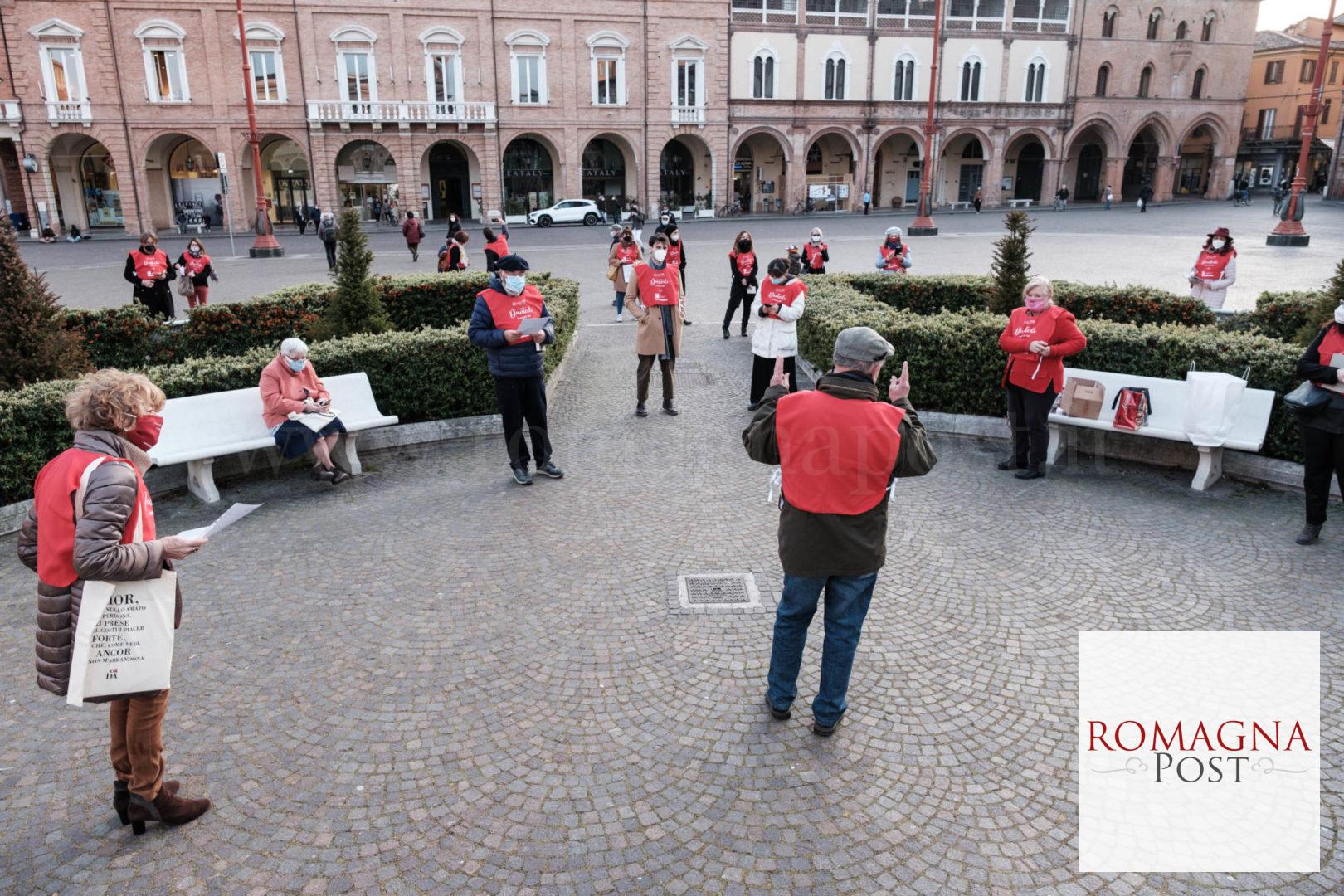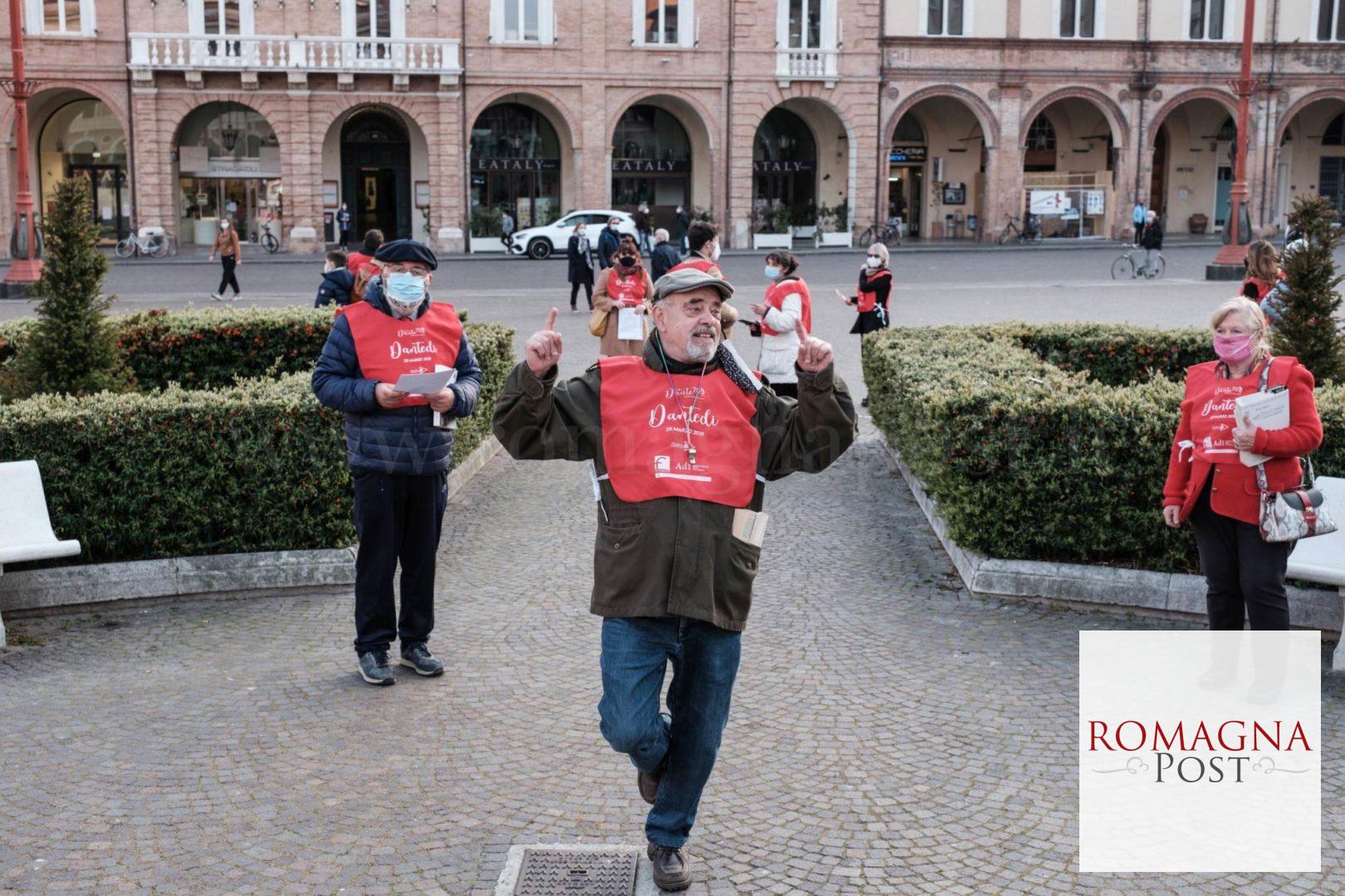 Nel pomeriggio, in piazza Saffi un gruppo di 33 cantori, indossando una pettorina rossa celebrativa, si è ritrovato per omaggiare il Sommo Poeta con una flash comedy in cui, in cinque minuti, sono stati recitati in simultanea la prima e l’ultima terzina di ogni canto della Commedia.