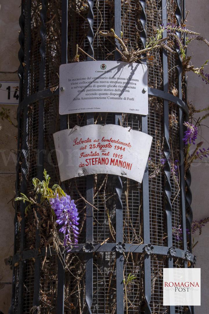 Il glicine più famoso di Forlì è sicuramente quello di via delle Torri, comunemente chiamato “il glicine di Manoni”. Fu infatti piantato nel 1915 da Stefano Manoni come ornamento della facciata della sua abitazione e del sottostante negozio di “spaccio di colori”, come veniva definito un tempo, e ferramenta (da qualche anno l’attività commerciale non è più esistente in quella sede essendosi spostata in corso Garibaldi).