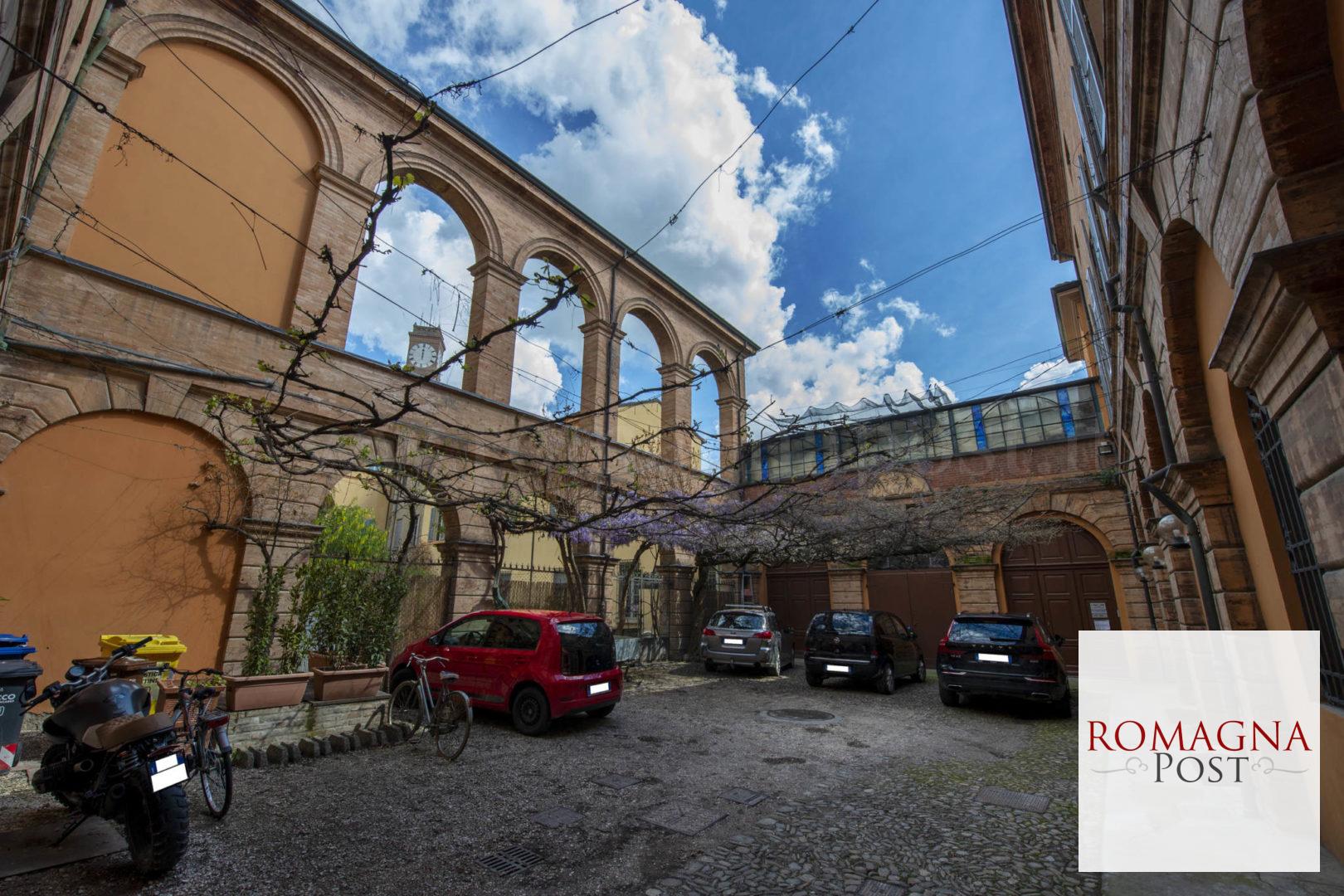 L’attuale facciata del palazzo, in stile neoclassico, fu realizzata nel 1786 su disegno dell’architetto Matteo Masotti (1756 -1825). L’edificio passò poi al conte Domenico Matteucci in seguito al matrimonio di sua figlia con il conte Giovanni Guarini, il quale nel 1855, su disegno dell’ingegnere Giulio Zambianchi (1817 – 1886), fece completare la facciata lungo l’attuale via Giorgina Saffi. Ed è dal numero 7 che si accede nel secondo cortile dove si può ammirare un caratteristico pergolato di glicini che desta sorpresa tanto che sono diversi i cittadini che passando in zona si fermano per ammirare le particolarità di questa area che fu ripristinata nel 1923 dall’avvocato Arnaldo Foschi che nel frattempo era divenuto proprietario di tutto il palazzo. Nel corso dei lavori vennero rinvenuti alcuni elementi architettonici rinascimentali, tra cui rilevanti, oltre alla ghiera in cotto finemente decorata visibile sotto il portico, sono i resti quattrocenteschi del cortile e, in direzione di piazza Saffi, l’arco in cotto al limite del portico.