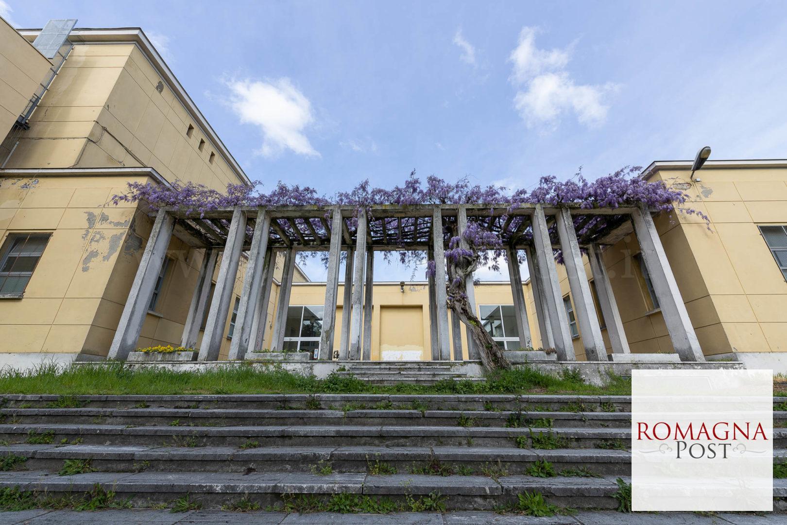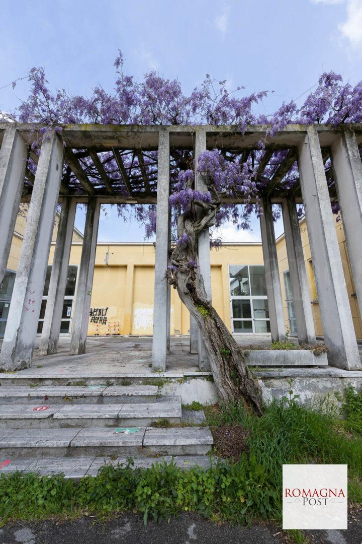Merita di essere segnalato fra i glicini storici di Forlì quello cresciuto su un’aiuola collocata a metà della scalinata di accesso posta sul retro dell’ex Collegio Aeronautico. Tutta questa zona, nonostante il valore monumentale del complesso, si presenta in condizioni di avanzato degrado anche per la mancanza della più minima manutenzione. Il glicine, nonostante il possente tronco presenti degli ammaloramenti consistenti, conserva una sua vegetazione costante e ogni anno si possono ammirare e odorare splendidi fiori. Allo stato attuale la pianta dovrebbe avere una ottantina di anni in quanto l’intero complesso fu realizzato fra il 1934 e il 1941 su progetto dell’architetto Cesare Valle (1902 – 2000).