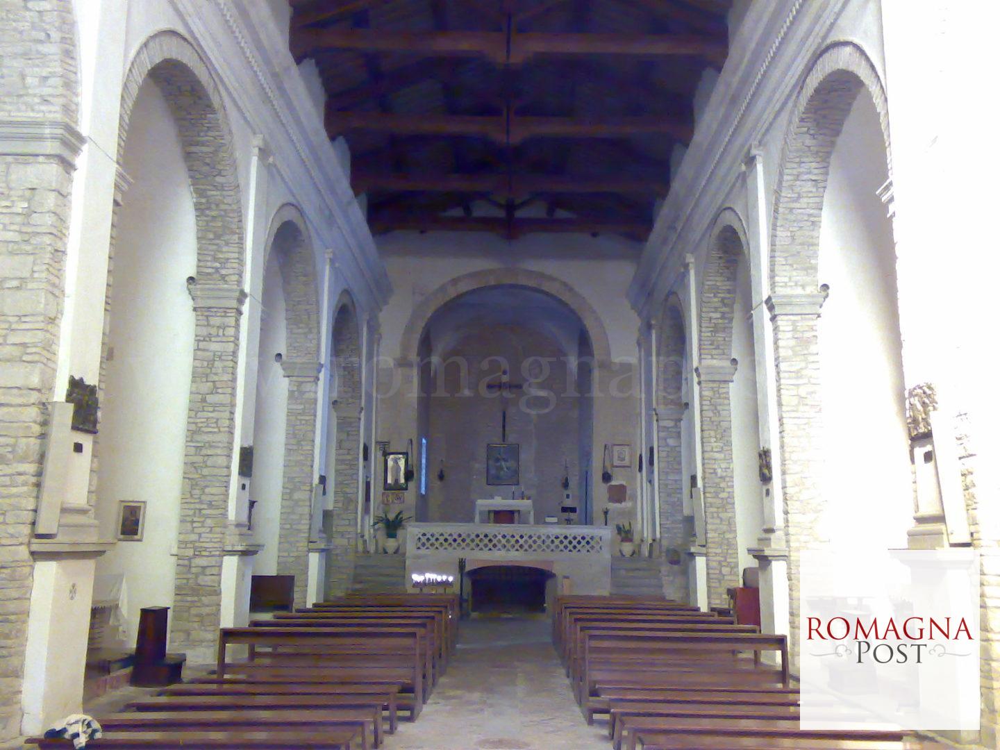 Il suggestivo ambiente interno della chiesa, a navata unica, è suddiviso su ogni lato in tutta la sua lunghezza in cinque nicchie mediante pilastri addossati sostenenti archi a tutto sesto e cappelle laterali coperte da volte a botte. Le cappelle con i pilastri, le lesene e la trabeazione che corre in alto in senso longitudinale fanno parte delle trasformazioni settecentesche. In fondo alla navata il presbiterio è soprelevato sulla cripta e diviso da una transenna in marmo traforata. Il breve coro quadrato, coperto da volta a crociera è illuminato da un’unica finestra aperta sulla sinistra.