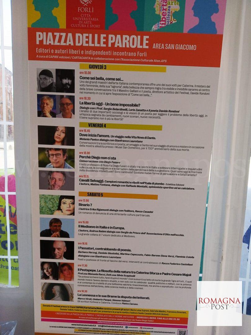 Il 5 giugno per la terza serata, dedicata al tema della bellezza, ci mostrerà Caterina come modello di donna per moderne ‘Caterina’, in cui le forlivesi saranno chiamate a partecipare a ‘Le belle e le tigri’ Noi siamo Caterina una lettura corale in cui l’estro femminile si traduce in musica, poesia, fotografia. Aprirà la serata lo spettacolo contemporaneo Caterina, uno studio di Orto del Brogliaccio per la regia e drammaturgia di gruppo a cura di Federico Bellini, potremo poi applaudire le cantanti forlivesi: Elena Faggi, dopo la sua partecipazione a Sanremo, Matilde Montanari con i Bodam Project e la giovane interprete Costanza Ragazzini. Le appassionate note dei Ranaway giovani musicisti forlivesi (un progetto di Cosascuola Music Academy) accompagneranno la performance dell’atelier d’arte di Julieta Manassas. Infine un omaggio della città al grande fotografo di moda e del ritratto Giovanni Gastel, recentemente scomparso.