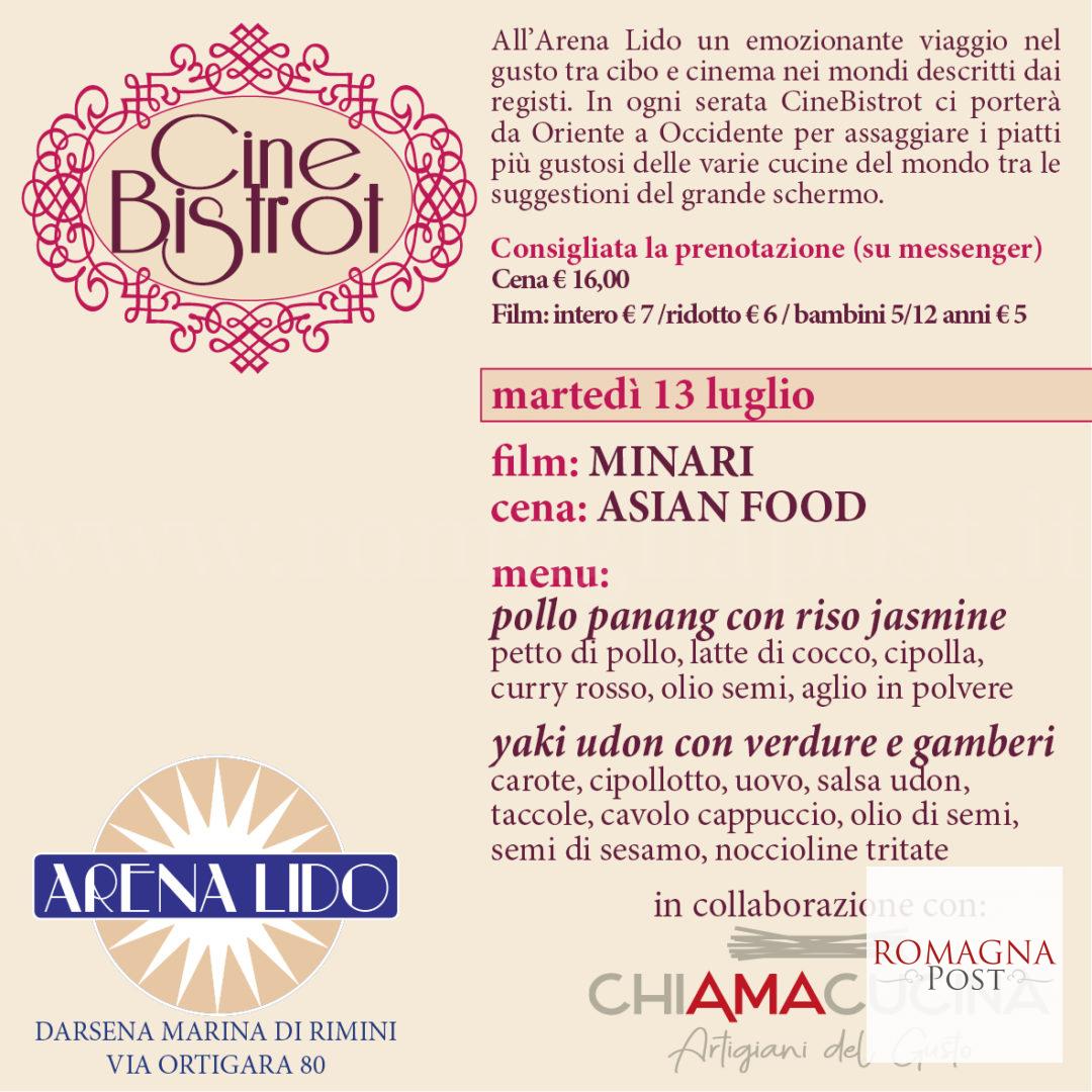 All’Arena Lido si accendono i riflettori sul Cine Bistrot. Ogni martedì alla darsena di Rimini la proiezione delle opere dei più rappresentativi registi statunitensi, messicani, spagnoli e asiatici sarà accompagnata da menù a tema per immergersi con tutti i sensi nell’atmosfera dei film.