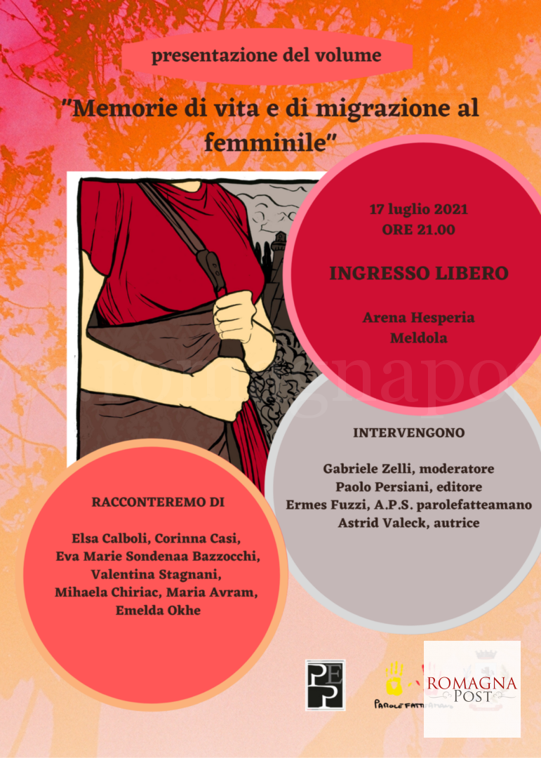 Mercoledì 14 luglio alle ore 21,00 all’Arena Hesperia di Meldola sarà presentato il libro “Memorie di vita e di migrazione al femminile” (Persiani editore). Il volume è frutto delle ricerche biografiche condotte da Astrid Valeck per l’APS parolefattemano. L’associazione, già molto conosciuta localmente, è punto di riferimento sul territorio della nostra provincia come in quelle limitrofe per la promozione della cultura autobiografica e delle biografie territoriali; opera in stretta collaborazione con la Libera Università dell’Autobiografia di Anghiari.
