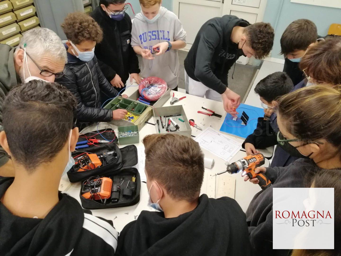 Gli appelli del G20 di Glasgow a gestire responsabilmente l’energia del pianeta sono già diventati azioni concrete per i 130 studenti della scuola media Franchini di Santarcangelo impegnati nel progetto di educazione alla sostenibilità “Noi siamo uno”. Tra tester, pinze, fili di rame e canaline, trapani, casco e imbragatura hanno partecipato in questi giorni ai laboratori “Energie & energia” sotto la guida degli esperti Stefano Bugli e Rinaldo Ioppi di Unoenergy, Iader Mazzoni di Fondazione Enaip e di Maurizio Bartolucci, presidente della Fondazione Francolini. A far da tutor speciali nel laboratorio energia e circuiti elettrici sono stati altri studenti: Loris, Nicolò, Gabriele, Orgen, Igli e Querine, prossimi alla qualifica di operatore di sistemi elettrici ed elettronici all’Enaip.