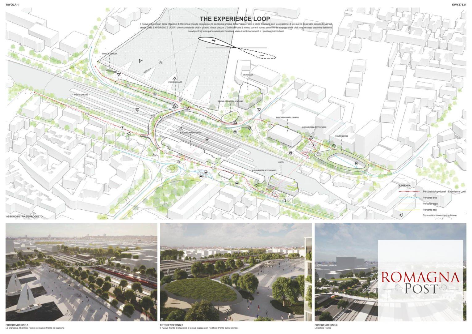 Il nuovo hub, come richiesto dal concorso, comprenderà il superamento dei binari mediante una passerella sopraelevata che dovrà caratterizzarsi anche come “belvedere” a 360° spaziando dalla Darsena al Mausoleo di Teodorico, dalla Rocca Brancaleone a piazza del Popolo fino alla basilica di Sant’Apollinare Nuovo e ai giardini pubblici; un parcheggio multipiano ad integrazione e in connessione con l’autostazione dei bus turistici e di linea in piazza Aldo Moro e con la stazione ferroviaria; l’ampliamento di edifici di servizio su viale Farini, di proprietà di RFI, e la ricostruzione dell’edificio ex Dogana che oggi ospita il comando della Polizia locale. Nel bando era richiesto anche il riassetto urbanistico e funzionale della testata del canale Candiano, tramite la realizzazione di una piazza pubblica fronte canale.