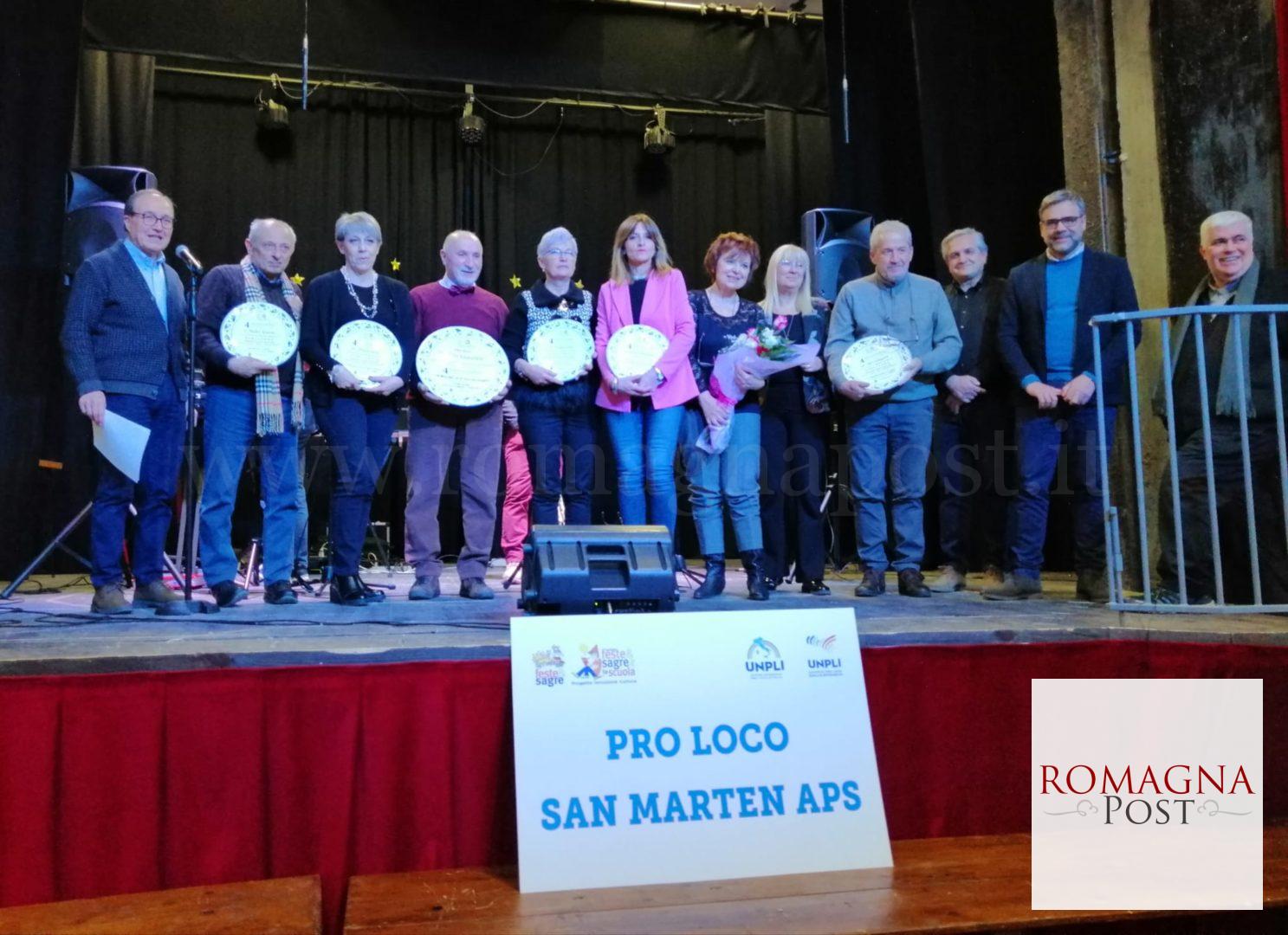 Durante il corso della serata Massimiliano Falerni e Alberto Capacci, rispettivamente componente della Giunta e consigliere dell’Unione Pro Loco d’Italia, hanno dato a Patrizia Carpi, presidente della Pro Loco San Martèn, una targa da parte dell’UNPLI nazionale nella quale viene sottolineato l’impegno profuso finora per la valorizzazione del dialetto da parte dell’associazione di San Martino in Villafranca.