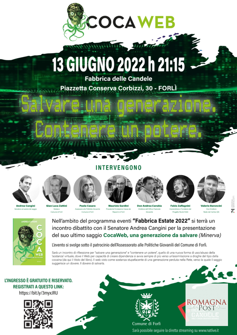 Lunedì 13 giugno, alle ore 21.15, nell’ambito del programma eventi “Fabbrica Estate 2022” si terrà un incontro dibattito con il senatore Andrea Cangini, incentrato sulla presentazione del suo ultimo saggio “Cocaweb. Una generazione da salvare” (Minerva Edizioni).