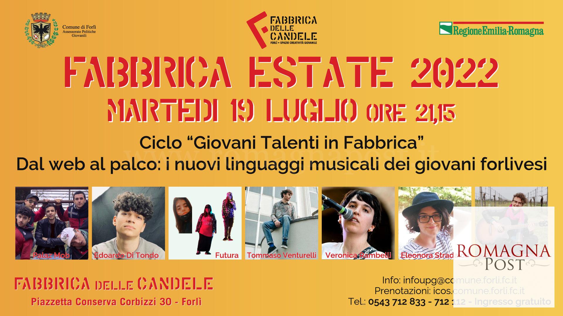 Dopo il grande successo riscosso dalla serata del 25 settembre 2021, torna quest’anno nel calendario eventi Fabbrica Estate 2022 il ciclo di incontri musicali “Giovani Talenti in Fabbrica”, dedicato ai musicisti emergenti forlivesi. Il primo evento del ciclo vedrà sul palco alcuni giovani cantautori e musicisti che hanno ottenuto con i loro video sul web numerosi consensi e visualizzazioni.