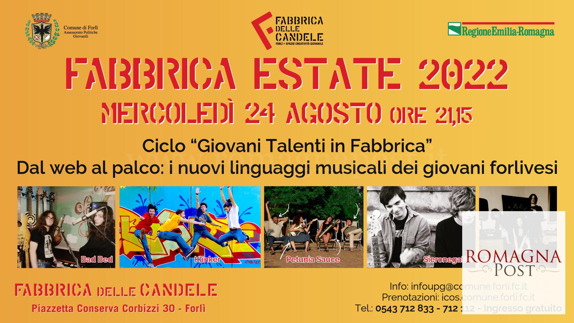 Dopo la serata dedicata ai Giovani Cantautori forlivesi, torna nel calendario eventi Fabbrica Estate 2022 il ciclo di incontri musicali “Giovani Talenti in Fabbrica”.