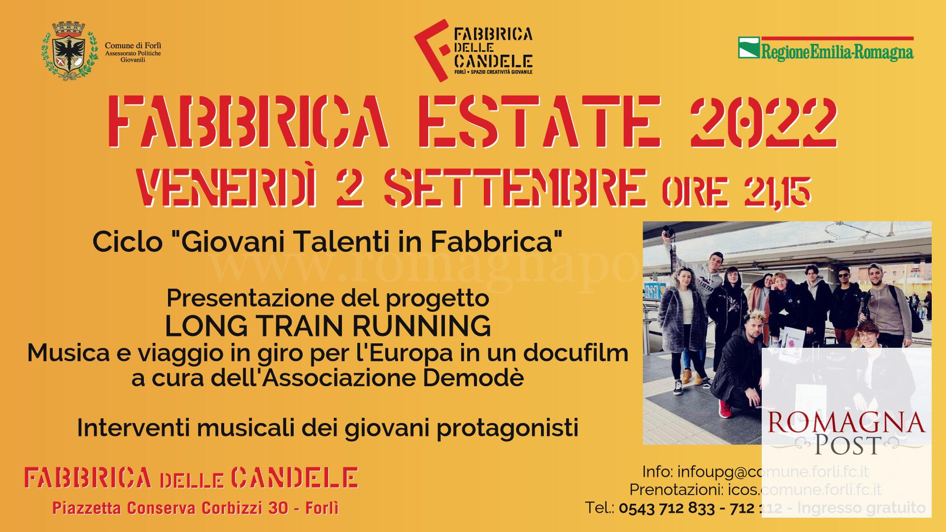 Venerdì 2 settembre, alle ore 21.15, sul palco estivo della Fabbrica delle Candele, piazzetta Conserva Corbizzi 30, a Forlì, jnell’ambito del ciclo “Giovani talenti in Fabbrica” verrà presentato il progetto “Long Train Running”.