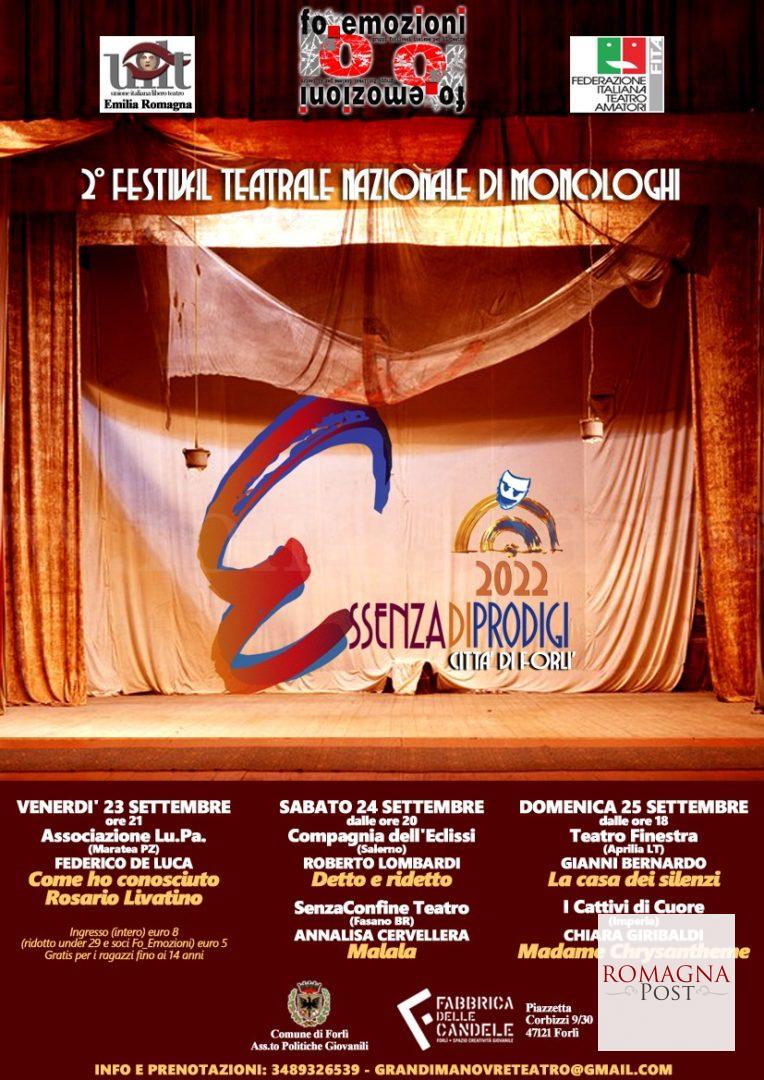 Dal 23 al 25 settembre 2022, il Teatro della Fabbrica delle Candele di Forlì ospiterà la seconda edizione del Festival di monologhi “Essenza di Prodigi-Città di Forlì”, organizzato da “Fo_Emozioni” in collaborazione con l’Assessorato alle Politiche Giovanili del Comune di Forlì.”Sappiamo tutti che il Monologo teatrale, è una tecnica narrativa che, interpretata da una sola persona, racconta pensieri, esistenze, impressioni, ricordi, testimoniando emozioni e idee. Non prevede interazioni in scena, se non con se stessi, ma deve attivare un legame con il pubblico, per creare un prodigio, un’Essenza di Prodigi. I cinque monologhi del nostro Festival, sapranno coinvolgere il pubblico con guizzi di raffinata ironia e spaccati di intenso turbamento, portando gli spettatori in luoghi inaspettati, per incontrare anime che non potranno dimenticare. Come FO_Emozioni, siamo profondamente onorati di avere attori provenienti da ogni parte d’Italia che, con la meraviglia del Teatro, danno lustro alla nostra amata Forlì e alle nostre Compagnie”