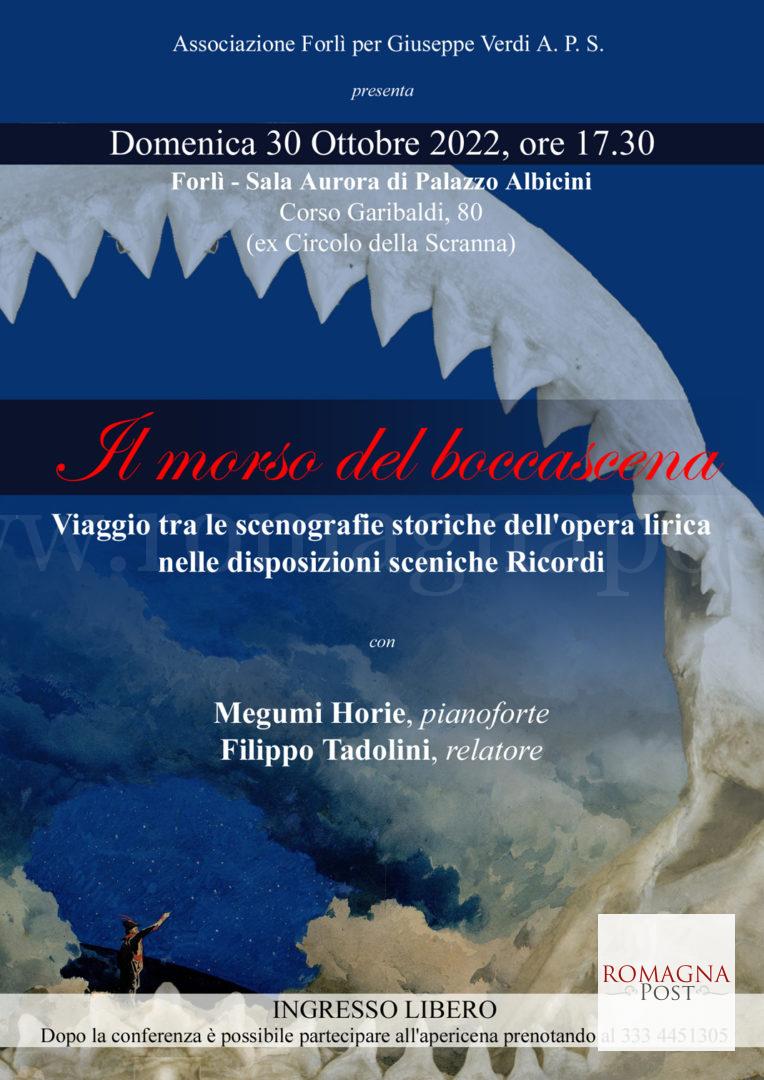 Domenica 30 ottobre, alle ore 17.30, presso la sala Aurora di Palazzo Albicini (ex Circolo della Scranna), corso Garibaldi 80, Forlì, l’Associazione Forlì per Giuseppe Verdi organizzerà un incontro dal titolo “Il Morso del boccascena. Viaggio tra le scenografie storiche dell’opera lirica nelle disposizioni sceniche Ricordi”.