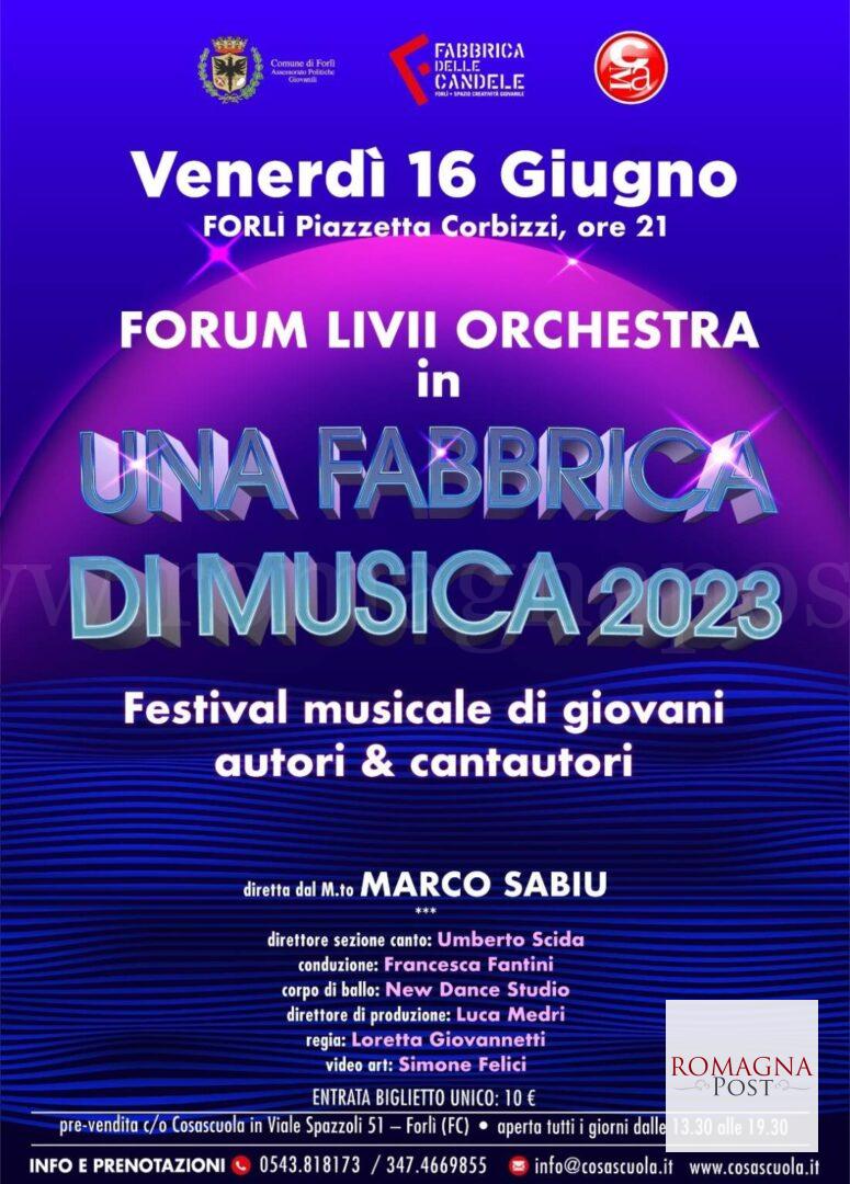 “Una Fabbrica di Musica – Festival musicale di Giovani Autori & Cantautori” consiste in un percorso di crescita artistica per giovani musicisti e cantanti forlivesi (studenti e professionisti) che quest’ anno si è sviluppato come estensione del progetto realizzato nel Giugno del 2022.