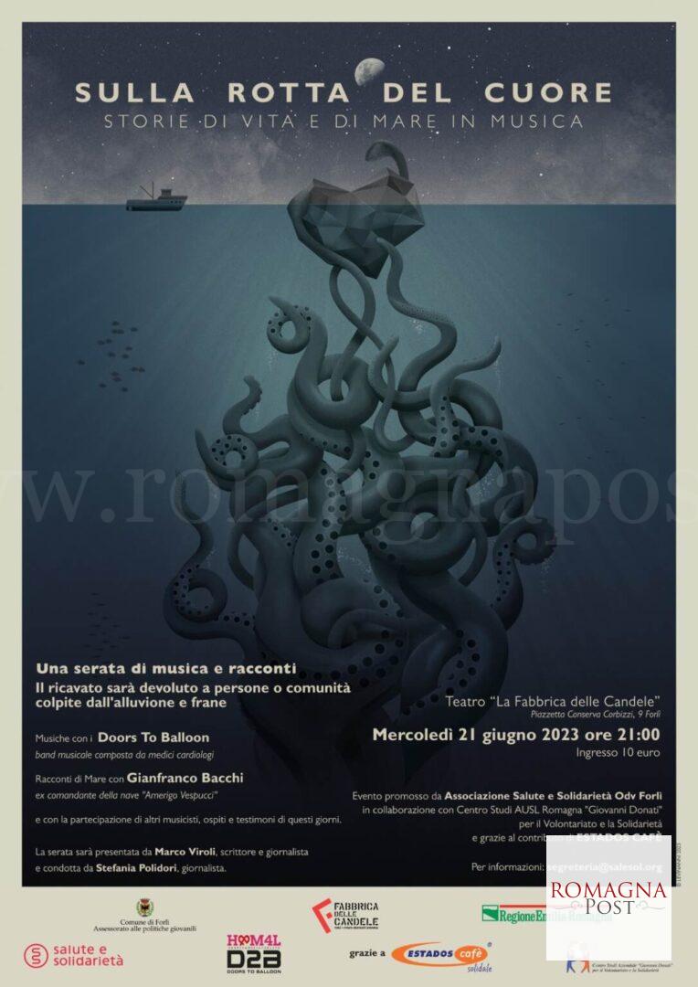 L’Associazione Salute e Solidarietà Odv e il Centro studi aziendale Ausl Romagna “Gianni Donati” per il volontariato e la solidarietà organizzano con il sostegno dell’Assessorato alle Politiche giovanili del Comune di Forlì e grazie al contributo di Estados Cafè, l’evento “Sulla rotta del cuore. Storie di vite e di mare in musica”, mercoledì 21 giugno, ore 21.15, alla Fabbrica delle Candele di Forlì.