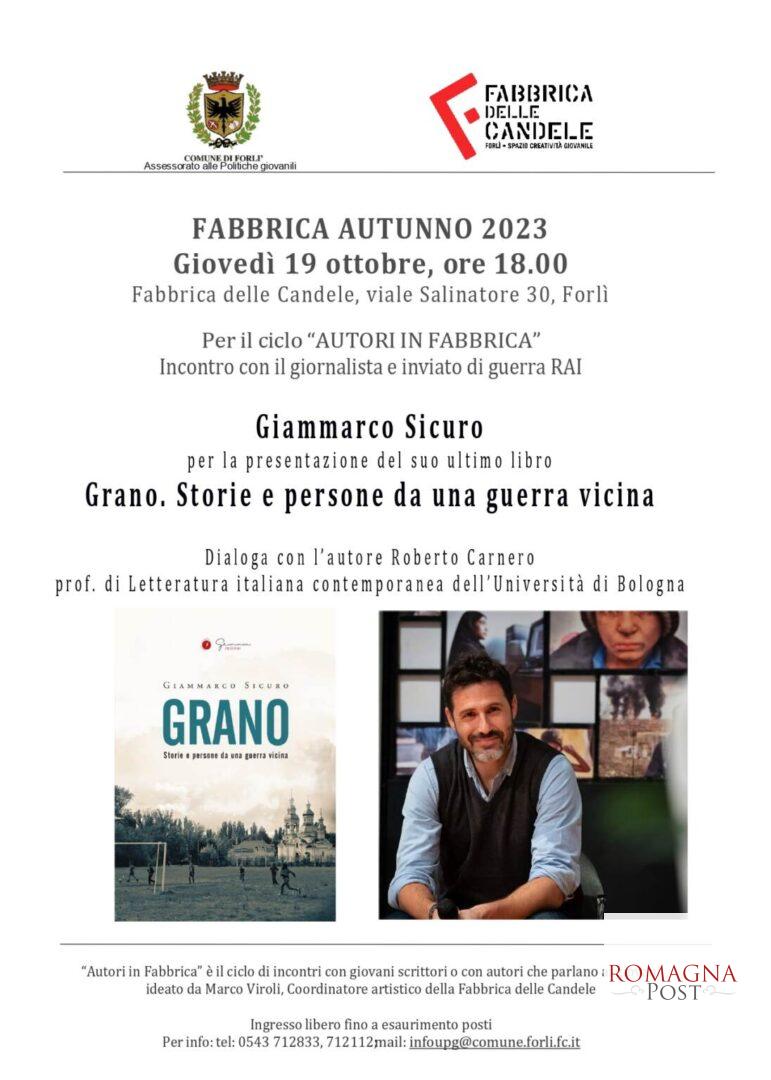 Giovedì 19 ottobre 2023, alle ore 18.00, l’Assessorato alle Politiche giovanili del Comune di Forlì, per il ciclo “Autori in Fabbrica”, presenta alla Sala Teatro della Fabbrica delle Candele “Grano. Storie e persone da una guerra vicina”, il nuovo libro di Giammarco Sicuro, giornalista e inviato di guerra RAI.