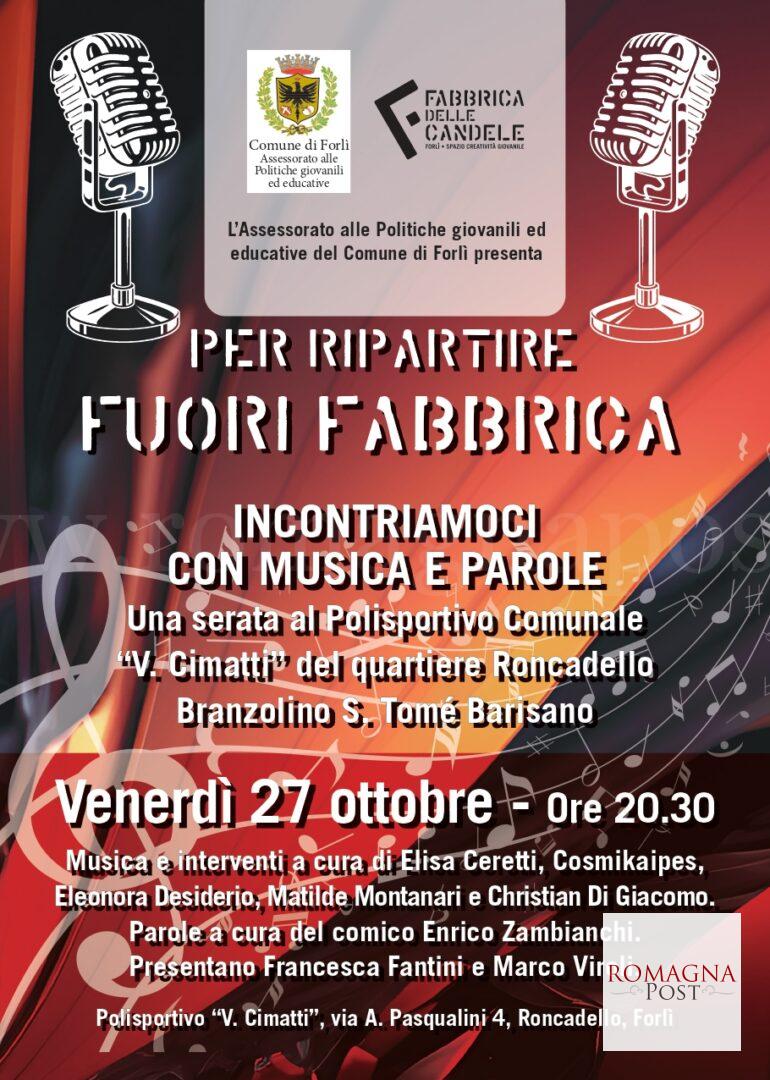 Venerdì 27 ottobre, la Fabbrica delle Candele torna in trasferta e lo fa organizzando un quarto appuntamento di “Fuori Fabbrica” presso il Polisportivo “V. Cimatti” di Roncadello.
