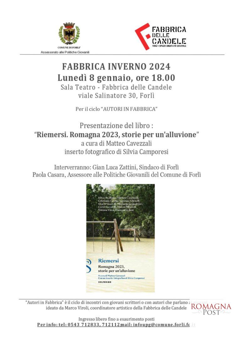 Prende il via il ciclo d’incontri “Autori in Fabbrica” promosso dall’Assessorato alle Politiche Giovanili del Comune di Forlì. Per il primo appuntamento della rassegna il libro “Riemersi. Romagna 2023, storie per un’alluvione”, presentato lunedì 8 gennaio, ore 18:00, presso la Sala Teatro della Fabbrica delle Candele.