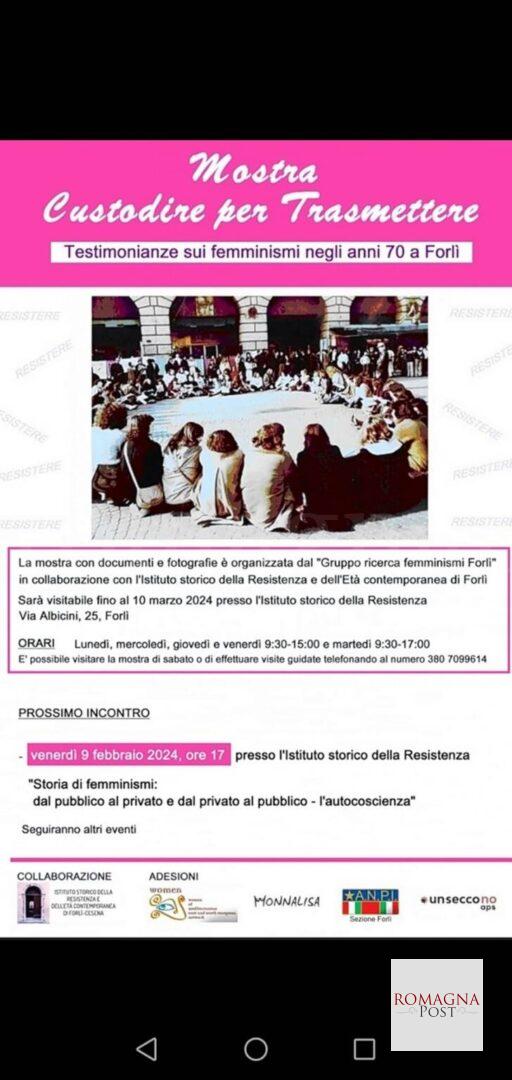 L’iniziativa è promossa dal Gruppo di ricerca femminismi a Forlì, che nella stesso luogo ha allestito la mostra fotografica e documentaria “Custodire per trasmettere. Testimonianze sui femminismi negli anni Settanta a Forlì (visitabile fino al 10 marzo nei giorni di lunedì, mercoledì, giovedì e venerdì dalle 9.30 alle 15.00 e il martedì dalle 9.30 alle 17.00).