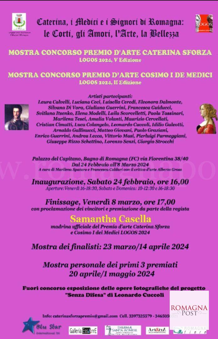 A Bagno di Romagna, dal 24 febbraio all’8 marzo 2024, tredici artiste e quindici artisti con le loro opere, dipinti, ceramiche, sculture, fotografie, installazioni, abbelliranno le sale dello storico Palazzo del Capitano di Bagno di Romagna in occasione dell’evento Caterina, i Medici e i Signori di Romagna: le Corti, gli Amori, l’Arte, la Bellezza. Mostra concorso Premio d’arte Caterina Sforza e Cosimo I dei Medici LOGOS 2024.
