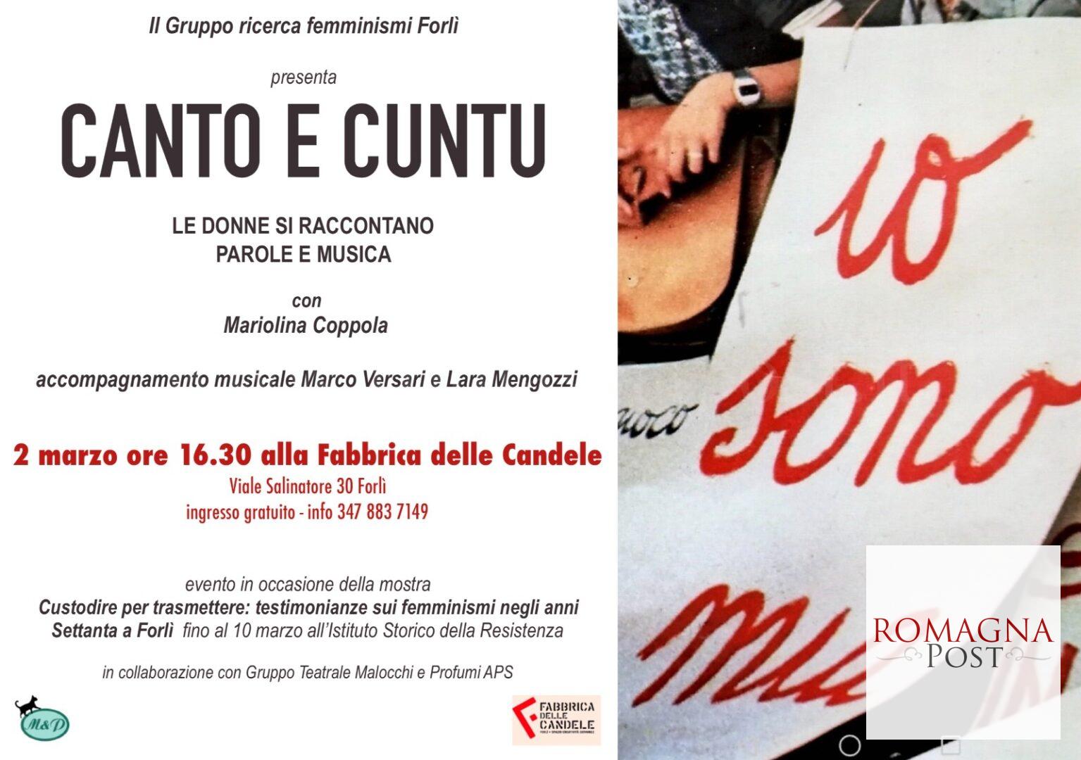 Il monologo di Mariolina Coppola dal titolo ‘Canto e Cuntu’, con l’accompagnamento musicale di Marco Versari e Lara Mengozzi, è un viaggio semiserio su quelle che, nel corso degli anni, sono state le riflessioni delle donne su se stesse e sulle proprie condizioni di vita nel pubblico e nel privato, in un progressivo smarcamento dagli stereotipi dei ruoli e dei sentimenti e dai condizionamenti di un pensiero maschile. Dalla prima Donna, che il mito vuole colpevole di tutti i mali del mondo, ai ruoli della mogliettina e della mammina italiana degli anni Sessanta, fino alla denuncia della violenza in ambito familiare o alla libera scelta sulla maternità .