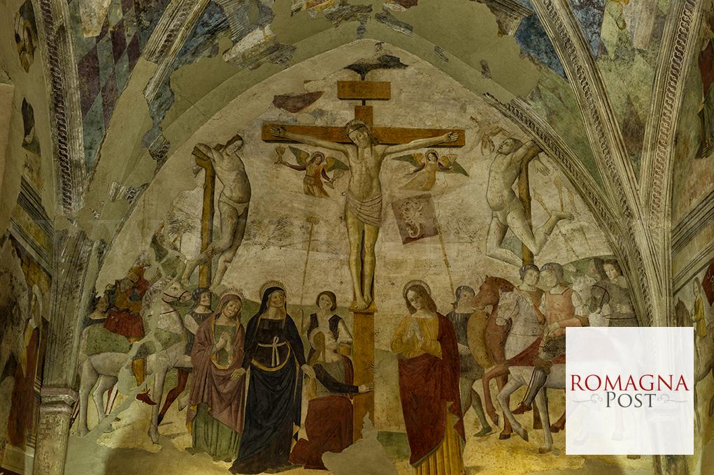 La parte più antica dell’edificio, sicuramente più volte rimaneggiata, la ritroviamo prospiciente la via principale del nucleo storico di Meldola. Fu fatta riedificare nel 1604 dal cardinale Pietro Aldobrandini su disegno di Giovan Battista Aleotti, detto l’Argenta, ed è stata sede del civico nosocomio fino al 1972. Incastonata nella costruzione dell’ex Ospedale del Santissimo Crocefisso, la chiesina, che è di proprietà dell’AUSL Romagna, costituisce un prezioso spazio espositivo utilizzato per mostre in concessione al Comune di Meldola. Si tratta di una cappella, a forme gotiche e pareti interamente affrescate, inserita nella chiesa seicentesca ad unica navata con cappelle laterali sul lato di sinistra, mentre sulla parete destra entro lunette sono inserite vecchie statue in cartapesta. Poiché l’autore dei pregevolissimi affreschi non è noto e gli storici dell’arte che li hanno studiati non sono arrivati a una conclusione unanime per quanto riguarda l’attribuzione di chi li ha dipinti, Marco Vallicelli sostiene che debba essere riconsiderata la possibilità che a realizzarli possa essere stato il pittore Giovanni Del Sega (Forlì 1450 circa – 1527), allievo di Melozzo da Forlì ed attivo principalmente a Carpi. Considerata la loro importanza è del parere che debbano essere effettuate delle indagini più approfondite e complete.