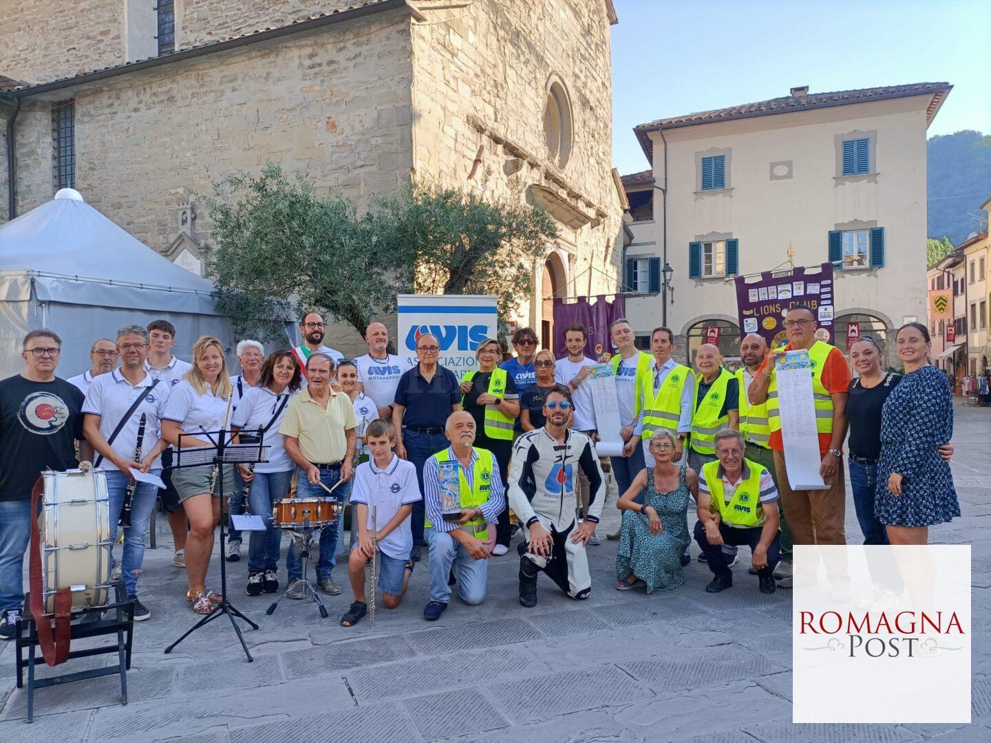 La Staffetta che da Santa Sofia ha raggiunto Bagno di Romagna era composta da aderenti dell’Associazione MotorSport Avis Forlì, di cui è presidente Luca Borsetto. In piazza Ricasoli, di fronte alla millenaria Basilica di Santa Maria Assunta, la Banda di “Santa Cecilia”, l’assessore al Turismo Mattia Lusini ed il sindaco Enrico Spighi hanno accolto i partecipanti all’iniziativa ed è stato il primo cittadino ad esprimere condivisione per la manifestazione dichiarandosi onorato per aver firmato la pergamena di partecipazione già sottoscritta da decine di amministratori locali. Alla cerimonia erano presenti Caterina Rondelli, presidente di Zona Lions, Michele Crociani, presidente del Lions Club Valle del Savio, unitamente ai soci Filippo Zanelli, Sara Pennacchi e Tristano Zanelli, che si sono adoperati per la riuscita dell’incontro. Significativa anche la partecipazione di soci Lions dei Club forlivesi: Stefano Ranieri e Luciano Valentini, rispettivamente presidenti dei Club Valle del Bidente e Forlì Host, Giovanni Mosconi e Gabriele Zelli, nonché dell’Avis con Giulio Marabini e Enrico Vetricini, vice presidenti Avis comunale Forlì, e Giuseppe Pretolani, dell’Avis di Bagno di Romagna.