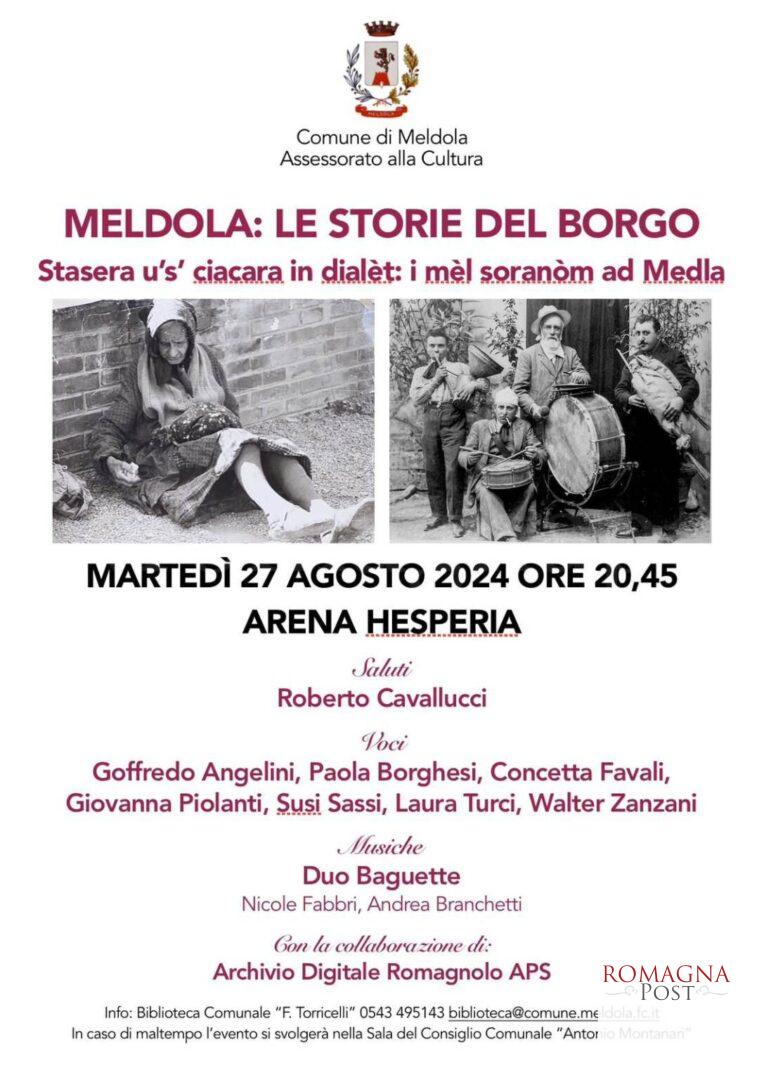 Martedì 27 agosto 2024, alle ore 20,45, presso l’Arena Hesperia di Meldola, l’Amministrazione Comunale presenterà “Le storie del borgo. Stasera u’s’ ciacara in dialèt: i mél soranòm ad Médla”; un viaggio nel passato della nostra Città attraverso i “Soprannomi”.