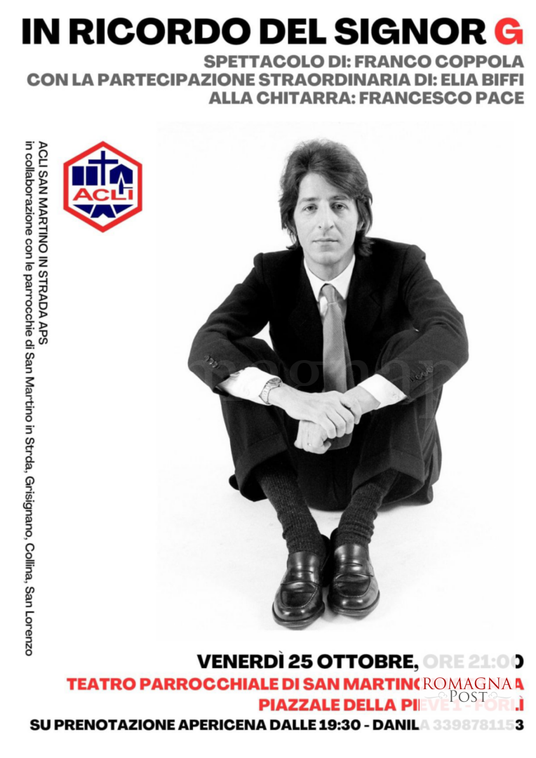 Il circolo ACLI di San Martino in Strada rende omaggio al genio di Giorgio Gaber, indimenticabile e indimenticato protagonista del Teatro Canzone italiano. Venerdì 25 ottobre alle 21, al teatro parrocchiale di piazzale della Pieve, l’attore e performer milanese Franco Coppola porterà in scena lo spettacolo “In ricordo del Signor G”. Ad accompagnarlo il chitarrista Francesco Pace e il giovane artista forlivese Elia Biffi, in uno spazio tagliato sulle sue sue caratteristiche.