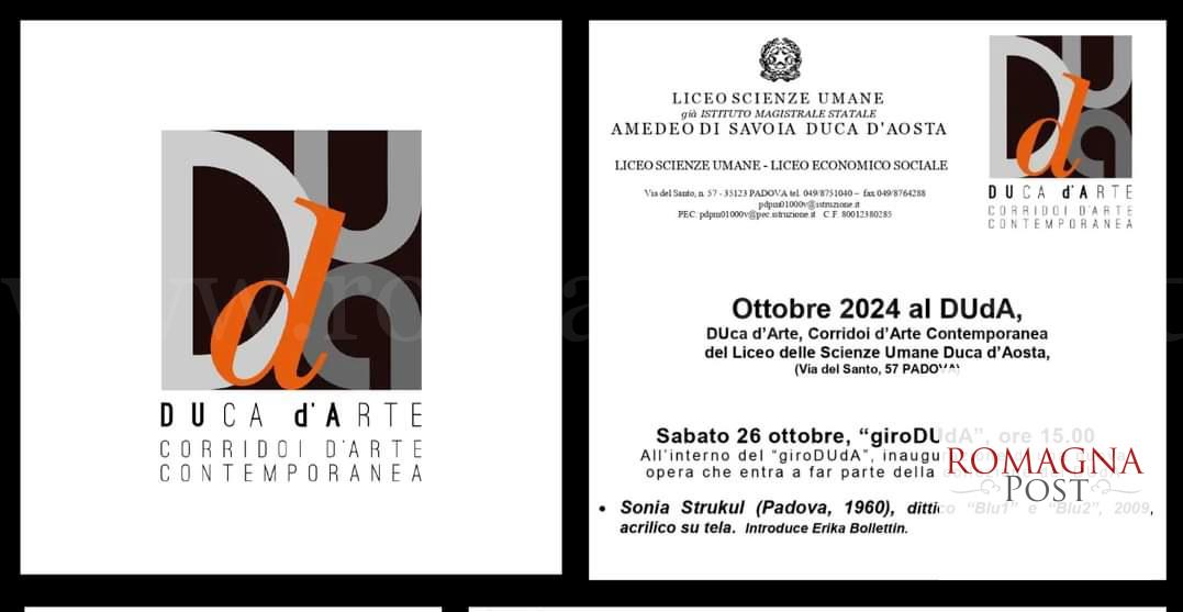 Il Liceo delle Scienze Umane “Amedeo di Savoia Duca d’Aosta” situato nel cuore pulsante della splendida città di Padova presenta un evento artistico di rilevante importanza. Sabato 26 ottobre 2024 alle ore 15,00 ospiterà l’inaugurazione dell’opera “Blu1” e “Blu 2” dell’artista padovana Sonia Strukul e l’introduzione critica verrà affidata alla giornalista Erika Bollettin. Il dittico entrerà così a far parte della prestigiosa collezione del progetto DUdA – Duca d’Arte, Corridoi d’Arte Contemporanea, progetto scolastico e artistico ideato dal Preside Alberto Danieli che ha trasformato i corridoi della scuola in una galleria d’arte che intende essere senza limiti e confini. Qui sono presenti infatti oltre 120 opere, realizzate da artisti di spicco del panorama padovano. Le opere artistiche adornano le porte delle aule, offrendo agli studenti un’opportunità unica per studiare e crescere in un luogo impregnato d’arte, dove l’arte diviene appunto parte integrante e determinante del luogo stesso. L’artista Sonia Strukul è nata a Padova e dopo il diploma in Pittura conseguito all’Accademia di Belle Arti di Venezia ha proseguito la sua formazione all’École nationale supérieure des Beaux-Arts di Parigi. Ha successivamente partecipato a innumerevoli mostre collettive e personali in Italia e all’estero. Ha partecipato anche a importanti Concorsi e Premi, riscuotendo meriti e consensi. Rilevanti e di spicco sono le collaborazioni con Balenciaga e Rubelli per i tessuti e Van Cleef per i gioielli. La sua creazione artistica spazia tra paesaggi onirici, animali, vegetazioni lussureggianti di un Eden perduto, dove l’uso vivo e incisivo del colore diviene il linguaggio specifico che sottolinea l’individualita’ e la personalità dell’artista, rendendola in tal modo, immediatamente riconoscibile. Il mondo che Sonia propone con la sua Arte è un mondo che piacerebbe a chiunque ami la natura, la fauna, la flora, le luci e i colori anche se è un mondo talmente perfetto da poterne fruire solo attraverso l’arte. Rosetta Savelli