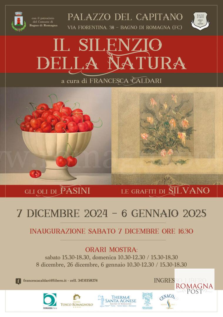 Palazzo del Capitano ospita questo quarto ed ultimo appuntamento espositivo di Bagno d’Arte 2024. La mostra “Il Silenzio della Natura” gli oli di Ugo Pasini e le grafiti di Silvano è promossa e patrocinata dal Comune di Bagno di Romagna.