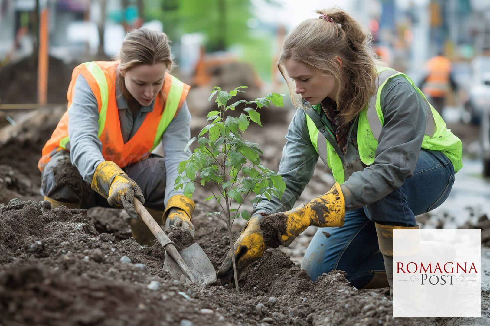 Two city workers are planting young trees in soil after removing pavement, contributing to urban greening.