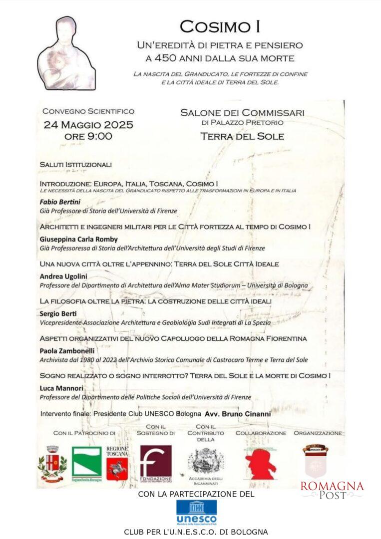 Sarà un piacevole ritorno in Terra di Romagna ed in particolare a Palazzo Pretorio a Terra del Sole quello dell’avvocato Bruno Cinanni Presidente del Club U.N.E.S.C.O di Bologna nella mattinata di sabato 24 maggio 2025 per onorare la memoria storica e culturale di Cosimo I De’ Medici, ideatore e fondatore della Cittadella Medicea denominata Terra del Sole che con Castrocaro Terme, città termale e della Musica costituisce un unico Comune.