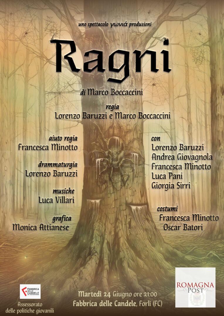 Martedì 24 giugno, nell’ambito della rassegna Fabbrica Estate 2025, va in scena “Ragni”, nuovo lavoro scritto dal giovane drammaturgo Marco Boccaccini con la regia condivisa con Lorenzo Baruzzi, anche autore della drammaturgia. Lo spettacolo sarà ospitato alla Fabbrica delle Candele di Forlì (Viale Salinatore, 30) con inizio alle ore 21.00.