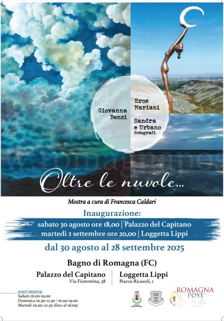Palazzo del Capitano e Loggetta Lippi diventano un unico grande contenitore culturale che parla di cieli infiniti, ospitando come secondo appuntamento di Bagno d’Arte 2025 la mostra Oltre le nuvole…, opere di Giovanna Benzi, Eros Mariani e di Sandra e Urbano fotografi.