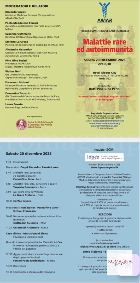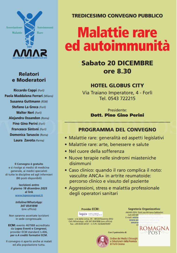 Il tredicesimo Convegno pubblico “Malattie rare ed Autoimmunita’ ” si terrà presso l’hotel Globus City a Forlì sabato 20 dicembre 2025 a partire dalle ore 8,30 fino alle ore 13,30.