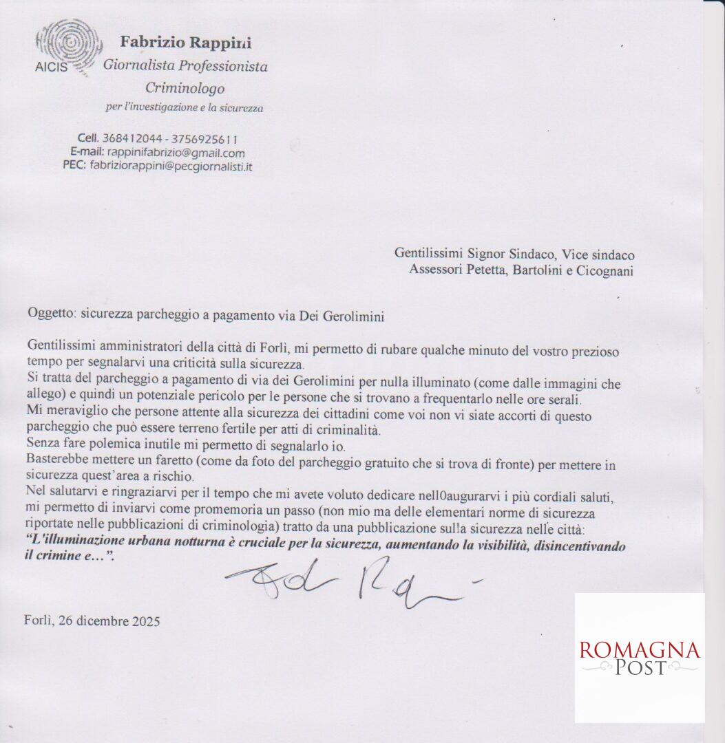 Un esempio negativo su come viene gestito il problema sicurezza a Forlì (città dove risiedo, ma di esempi in giro per il Paese ce ne sono tanti) è un parcheggio recentemente trasformato a pagamento, denominato “Gerolimini” dal nome della via dove è posto. È stato illuminato (male) dopo diverse segnalazioni agli amministratori poco attenti. In precedenza, come mostrano le foto, era ancora peggio e completamente al buio. Ora, però, da qualche giorno, è tornato alle origini primarie e quindi ancora insicuro.
